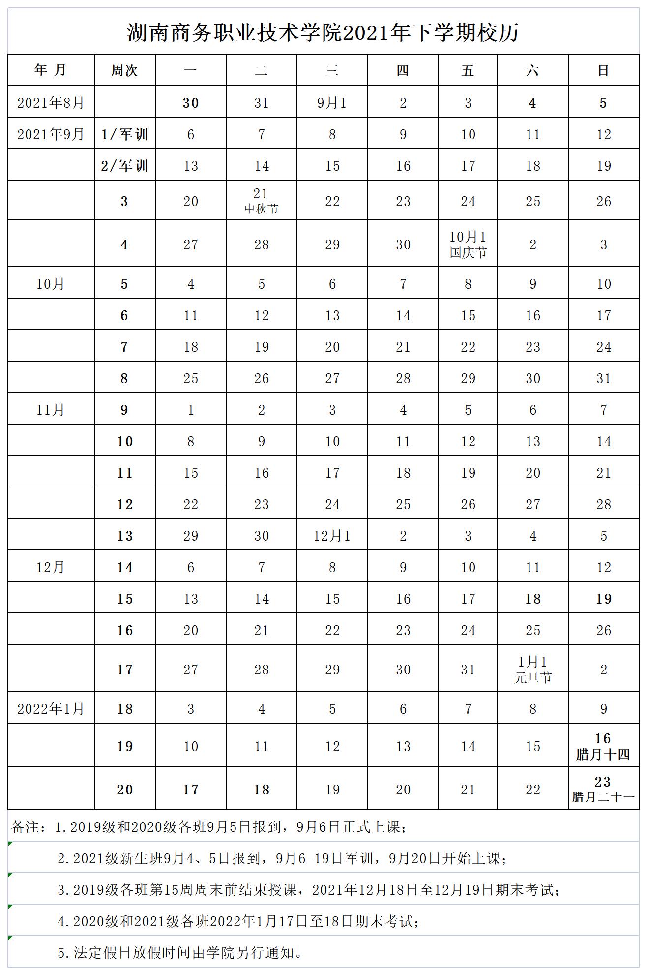 2021年下期校历