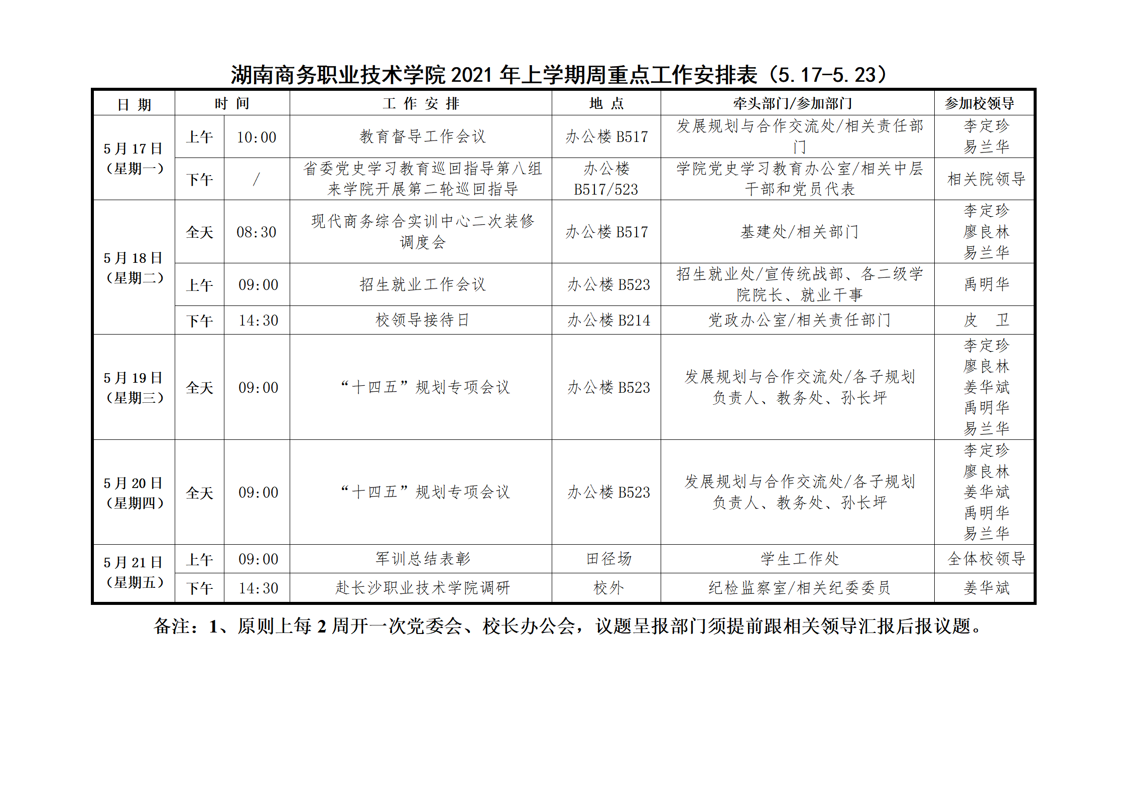 湖南商务职业技术学院2021年上学期周重点工作安排表(5.17-5.23)