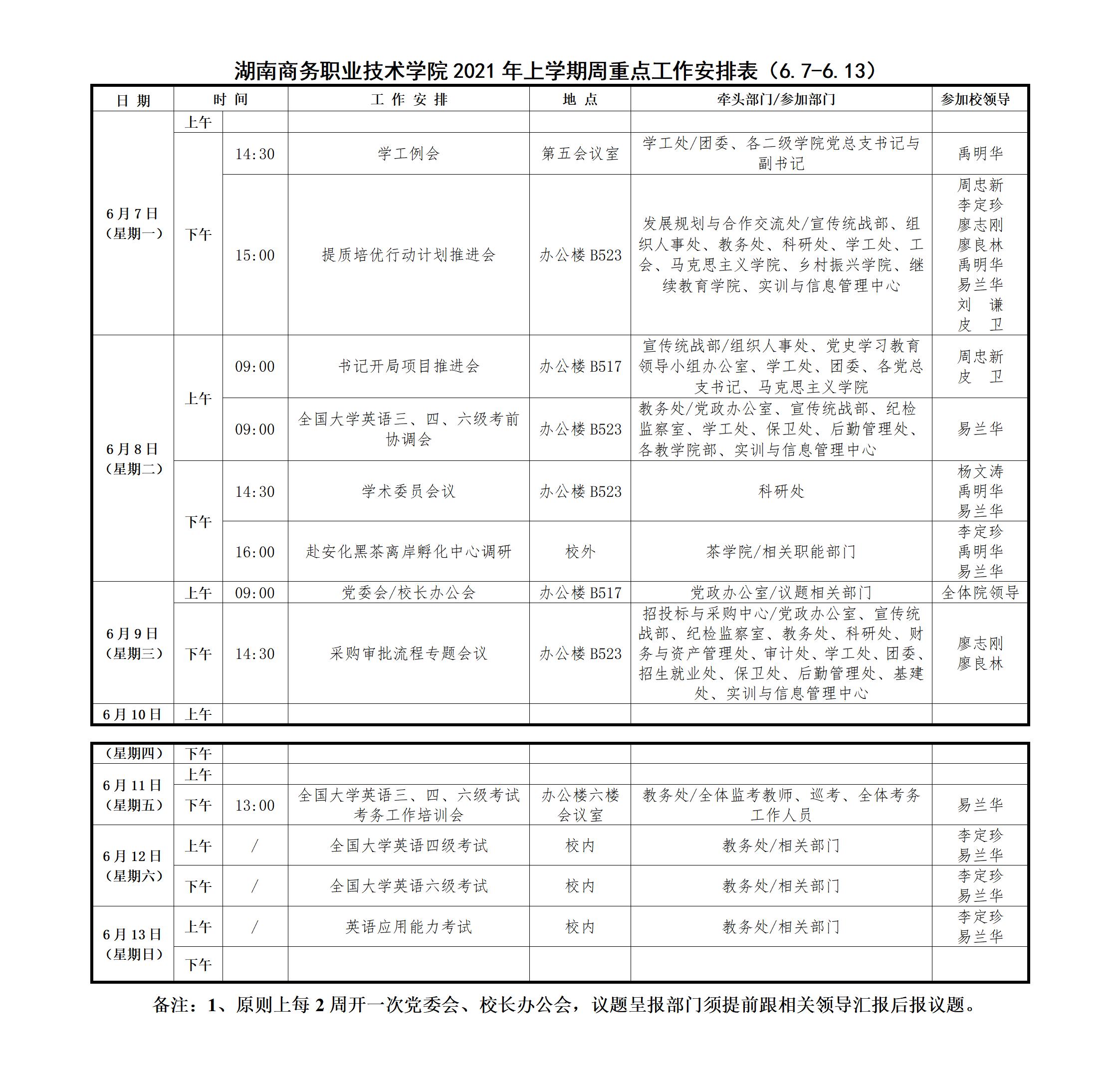 湖南商务职业技术学院2021年上学期周重点工作安排表(6.7-6.13)
