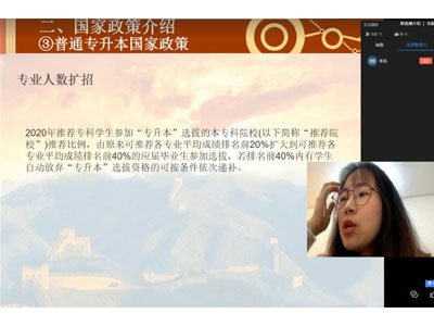 交流会上,会议主持人黄书敏以PPT形式向同学们讲解专升本的相关知识,让同学们对专升本有初步的了解。会议中,直播间的同学们积极提出问题,各专业的学长学姐们也热情的给与了答复。随后,16级设计1班高宏华、16级电商2班曾盛辉、16级国贸1班李扬以风趣幽默的形式向同学们分享了关于自己从备考到考前的专升本复习应考经验,并希望在场学生认真备考,珍惜此次学习机会。他们恳切的言辞、用心的分享,赢得了在场学生们一致好评。