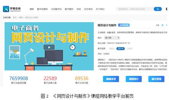 《网页设计与制作》课程主要培养学生商务网站开发的专业技能,掌握商务网站的开发和流程。课程针对网页设计岗位,内容由浅入深,采用“工学交替”“任务驱动”“项目导向”的形式开展教学活动,最终达到掌握网页设计与制作相关知识和技能的目标。教学团队共获得国家级、省级教学竞赛奖励多次,立项了多项省级课题,编写了1本课程同名教材《网页设计与制作》,2021年获得湖南省优秀教材。课程于2020年认定为湖南省精品在线开放课程。