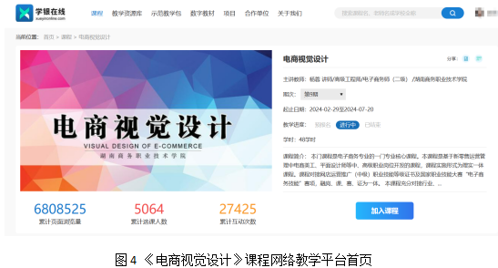 《电子商务视觉设计》课程是电子商务专业的核心课程,同时也是电商视觉设计岗位实践课程和赛证融通课程。该课程聚焦国家乡村振兴战略,根据电商视觉设计岗位国家、行业标准,依据国家与专业教学标准,紧扣专业人才培养方案、课程标准,以“德技并重 数商兴农”为主线,对接企业电商视觉设计岗位、电子商务技能竞赛要求、1+X网店运营推广职业技能考证,引入企业真实项目,构建以“岗课证赛”融合为导向的模块化课程教学体系,实现“‘零距离’上岗、课程教学、职业认证、以赛促学”四者的完美结合,于2023年立项为湖南省精品在线开放课程。