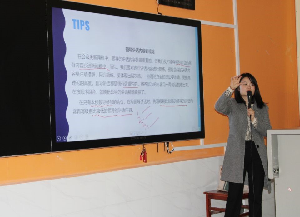 方舟老师通过PPT的方式为干部们讲授了新闻稿的撰写及修改,主要从了解新闻稿、撰写新闻稿、修改新闻稿三个方面进行讲解,并重点讲述了五个W一个H,即Who(何人)、What(何事)、When(何时)、Where (何地)、Why(为什么)和How(如何)的元素写作方法。方舟老师还简单明了的概括了新闻稿的主要内容,首先是活动名称、时间、地点等要素导语,紧接着便是正文,正文部分是新闻的核心内容。
