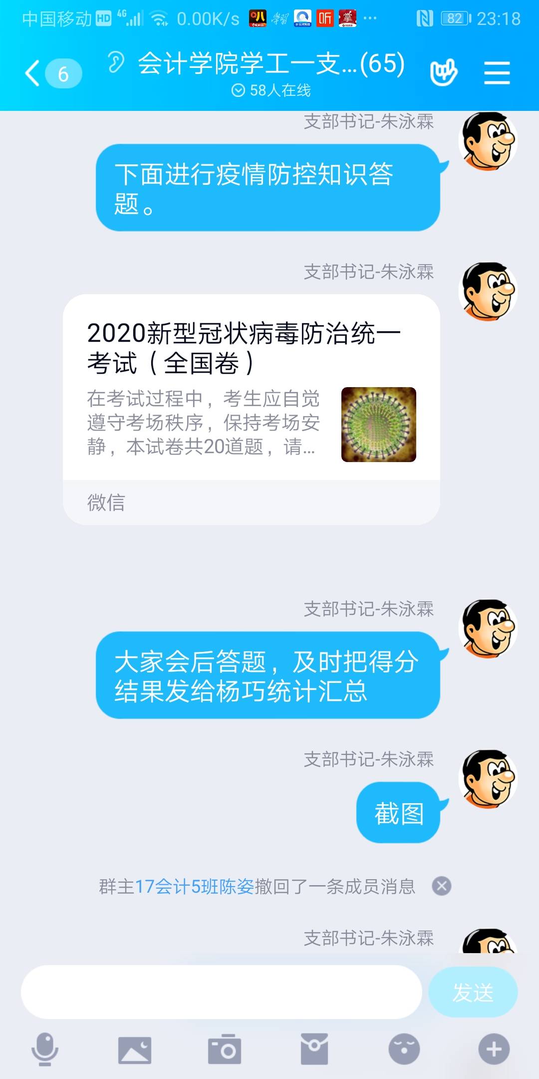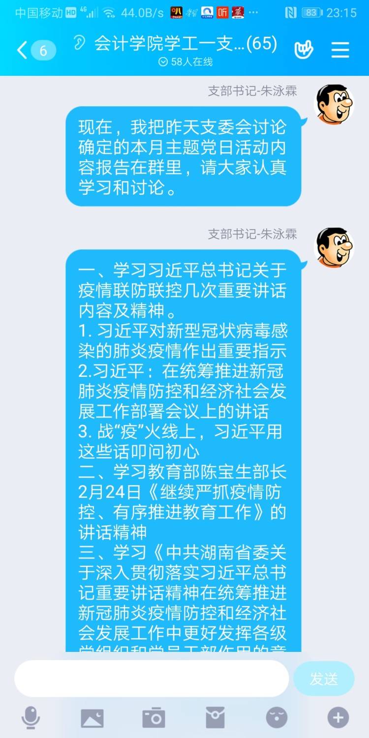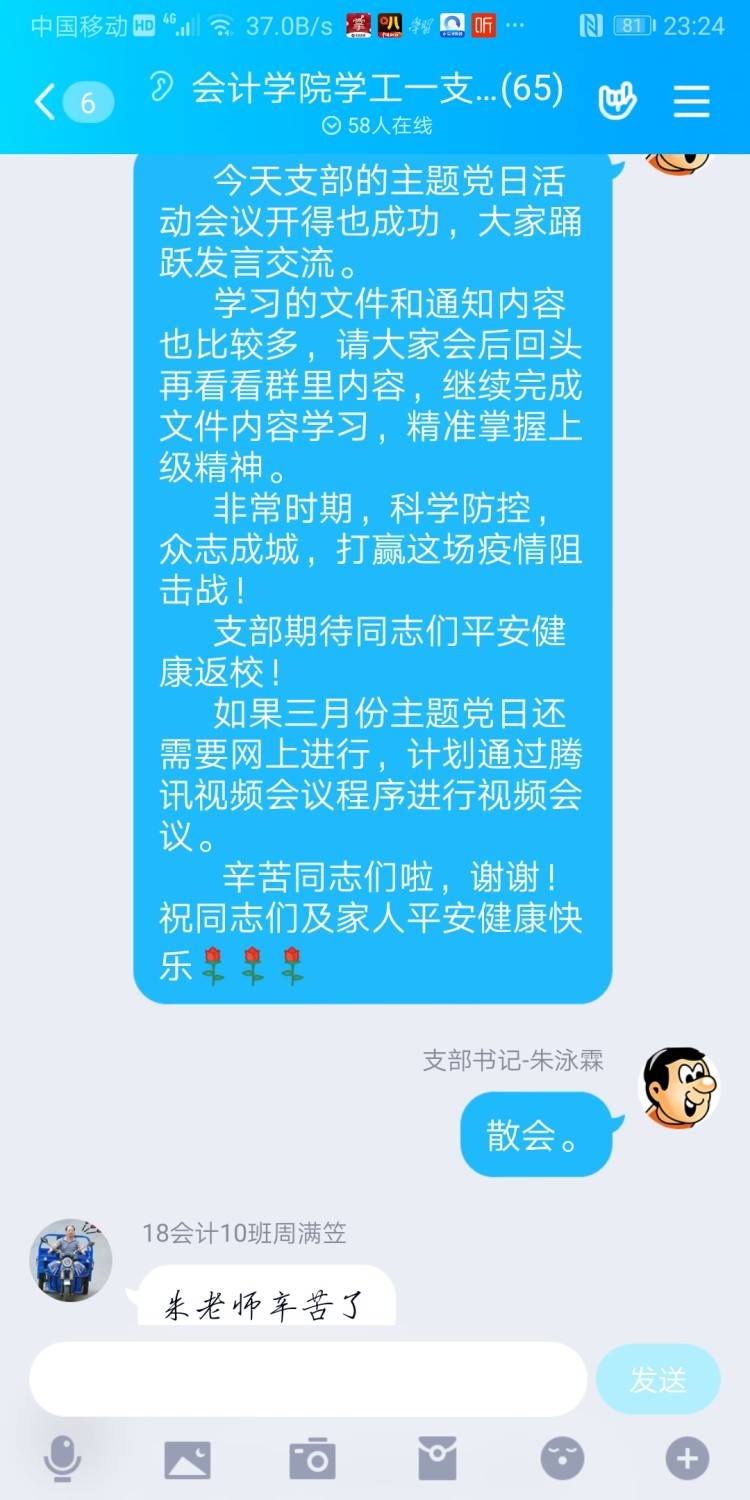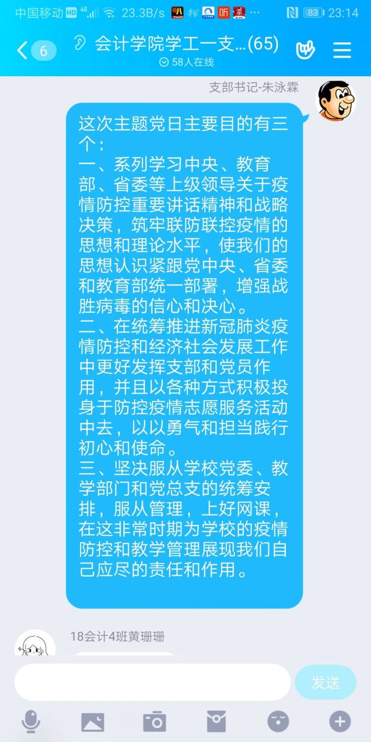 会计学院学工一党支部于2020年2月29日在支部QQ群里网上召开“我是党员我带头,疫情防控显身手”主题党日,参加本次会议的成员是会计学院学工一党支部全体成员,支部书记朱泳霖同志主持会议。 本次会议有以下几个内容: