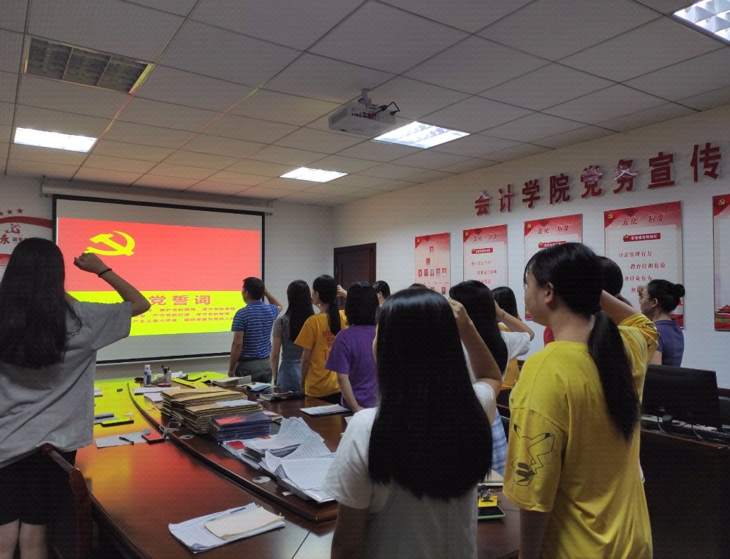 一、由朱泳霖书记带领会计学工一党支部全体成员重温入党誓词,提醒同志们不忘初心、牢记使命,永远奋斗。他谈到,今天是一个伟大的日子,我们党从当初的50多人,到现在的9千多万人,我们党在不断的发展,不断的壮大,强大起来了,这个征程经历了千辛万苦,也涌现了许许多多可歌可泣,前赴后继的英雄人物。
