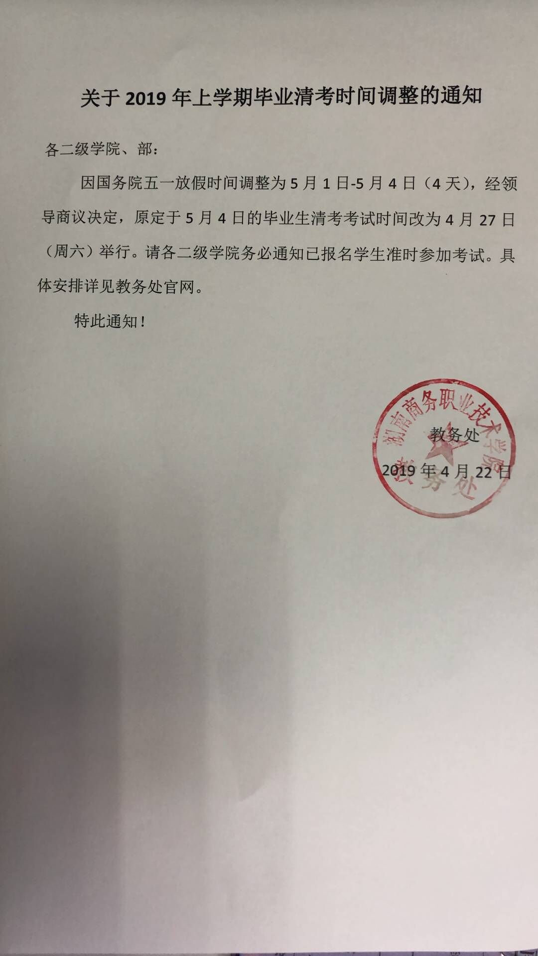 关于2019年上学期毕业清考时间调整的通知