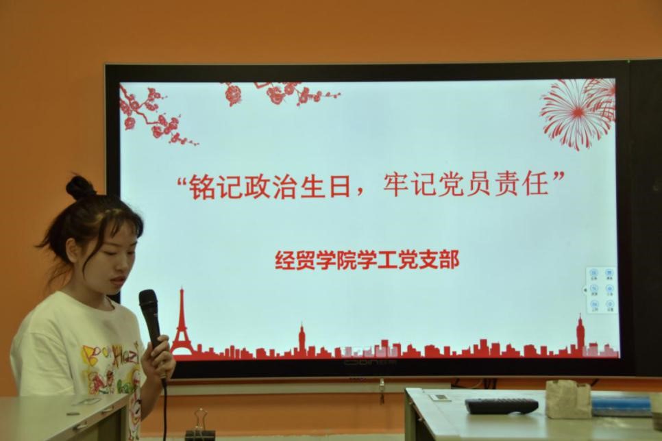 (通讯员:颜婷婷)2020年6月9日下午5:00,经济贸易学院学工党支部全体党员在第二教学楼101教师开展“铭记政治生日,牢记党员责任”党日活动。活动由学生党员王潇同志主持。