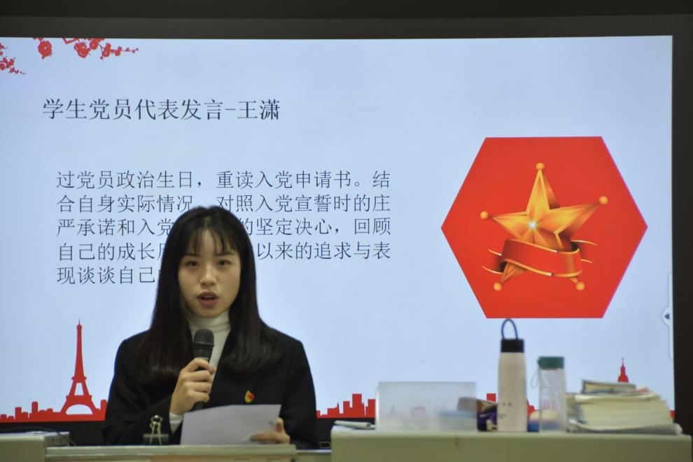 紧接着,全体党员同志重温入党誓词,学生党员代表王潇同志重读入党申请书,对照入党宣誓时的庄严承诺,回顾了自己的入党初心。支部教师党员为每一个过政治生日的党员赠送政治生日贺卡并合影留念。伴随着同志们雷鸣般的掌声,本次“铭记政治生日,牢记党员责任”党日活动圆满结束。