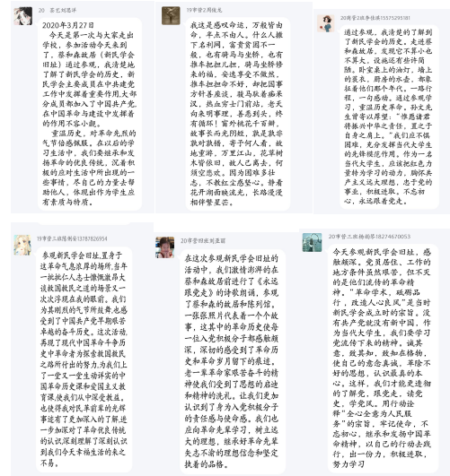 接下来,每个参加活动的入党积极分子在活动群内发表观后心得。其中,20级市场营销3班何宇轩写道:在看了这些前辈们的伟大事迹后,我忽然想起了最近“新疆棉事件”。此事一爆发,部分国人打砸抢有关商场、店铺、殴打店铺内销售员。可当我们再回头看看这些前辈们,他们不抢、不闹,他们将笔作为武器,将理想化作旗帜,为解放中国受苦的百姓们,他们的爱国是出于理想信念,而不是暴力与恐怖。”