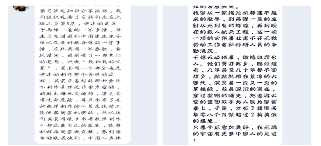 观影结束后,大家积极参与小组讨论并撰写学习心得。先锋营第七党小组的左蓉同学思绪万千:“干惊天动地的事业,做隐姓埋名的人是他们最生动的写照。年轻的科学家们将自己的青春奉献给了国家,因为工作的特殊性,他们和家人聚少离多,在家人对他们一无所知的岁月里,他们怀着一腔爱国之心投入祖国两弹一星研发中。在新时代,两弹一星精神永不过时。”