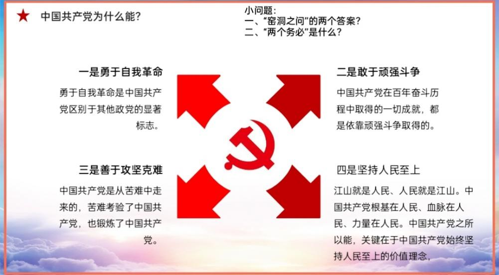 最后,主持人以提问的方式回顾了本次党日活动所学的知识。大家对“中国共产党为什么能?”进行积极的讨论。“敢于自我革命、敢于顽强斗争、善于攻坚克难、坚持人民至上。”“作为新时代的新青年,我们要积极传递为人民服务的正能量,拾金不昧、随手捡起地上的垃圾、参加抗疫志愿者……一件件小事,都因为为人民服务、忘我奉献变得不平凡。”“只有让人民来监督政府,政府才不敢松懈。只有人人起来负责,才不会人亡政息。”……弹幕不断。