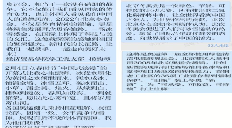 在本次活动中,入党积极分子通过观看直播赛事,对冬奥有了更加深入地了解,也有许多感悟。“青春向党”入党积极分子先锋营第四小组的胡双同学说:“2022年第二十四届冬奥会在我们北京举行,令我们每一个中国人感到无比自豪。当看到中国代表队运动健儿们矫健出场的时候,我心里不断涌上一阵阵热流。谷爱凌、苏翊鸣每个都是零零后,他们凭借着自己的努力,为国家夺得了一枚又一枚的金牌,让我们乃至国家都感受到了零零后的崛起。我真心为自己生长在中国感到骄傲和自豪,最后祝福我们的祖国越来越强大,祝奥运健儿们取得辉煌的成绩!”“青春向党”入党积极分子先锋营第十小组的罗芙蓉同学说:“观看了徐梦桃夺冠的视频,心中有颇多感触。让我明白了一个道理,所有的奇迹都是奋斗出来的结果。四届奥运征程,16年的坚守,徐梦桃以31岁的‘高龄’在家门口圆梦,取得了这个领域的最高荣誉。这就是坚持与热爱,这就是奥林匹克带给人们的精神财富,这就是奋斗不息,追梦不止。让我们携手一起向未来,不断发扬奥运精神。” 同时,在学习强国平台“经济贸易学院学工党支部组织”,经济贸易学院全体党员、入党积极分子积极交流了观看冬奥会的所感所想。党员谢雨同志说:“北京冬奥会给我的第一感觉是非常壮观!非常震撼!火炬手点燃奥运火炬的那一刹那,我热泪盈眶,为生为中国人感到无比自豪。‘青年兴则国兴,青年强则国家强’,我们当胸怀祖国、勤练本领、勇于担当,让青春在党和人民最需要的地方绽放绚丽之花。”