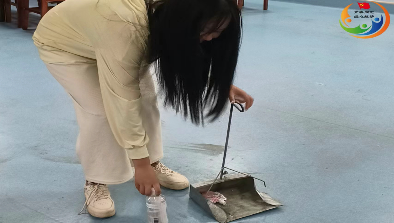 ▲22级市场营销2班戴娟琳在打扫卫生