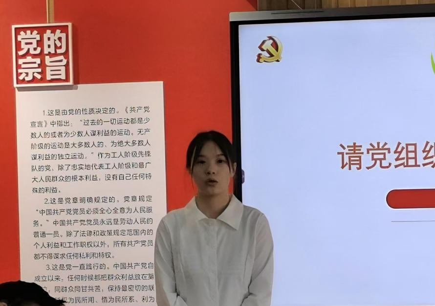 向党组织递交了入党申请书后,她不断学习,积极参加党支部的各项学习和实践,不断加强对党的理论的认识,提高自己的政治素养和理论水平的同时,深入关注社会实际和民生需求,积极参加社会实践,践行党的宗旨。每每问及她的入党初心,她说:“世上从未有从天而降的英雄,却有无数挺身而出的平凡人。在过往的岁月中,中国共产党让我明白什么是责任和担当、什么是团结和凝聚力。个人的力量有限,而集体的力量是不可估量的。我希望通过加入党组织,切实践行为中国人民谋幸福、为中华民族谋复兴的理想信念,为建设中国特色社会主义事业贡献自己的力量。”