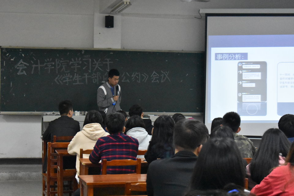 为了建设一支胸怀理想、心系同学、品学兼优、作风扎实的工作骨干队伍,共同维护组织形象,更好履行工作职责,湖南商务职院会计学院2019429日中午12:30分在二教310召开了本学期第一次全体学生干部会议,此次大会由团委副书记谢欧主持。