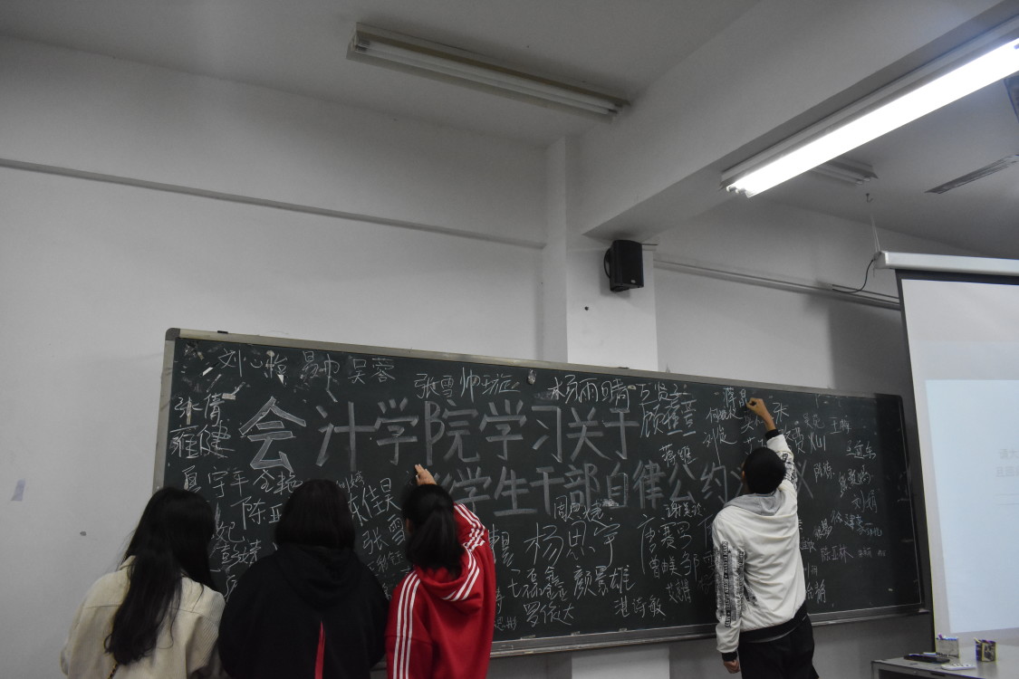 会议开始前,由纪检部进行会议点到。紧接着主持人开场白,宣布活动开始。学习学生会干自律公约,针对于学校功利化、庸俗化的现象进行讨论并通过PPT展示现象;针对于讨论出来的现象以及PPT展现出来的问题,提出解决办法,制定相应的制度;接着在会计学院主席唐悦带领第十五届团学分会全体学生会干部进行公约集体宣誓;最后全体学生会干部参与倡议签字仪式。