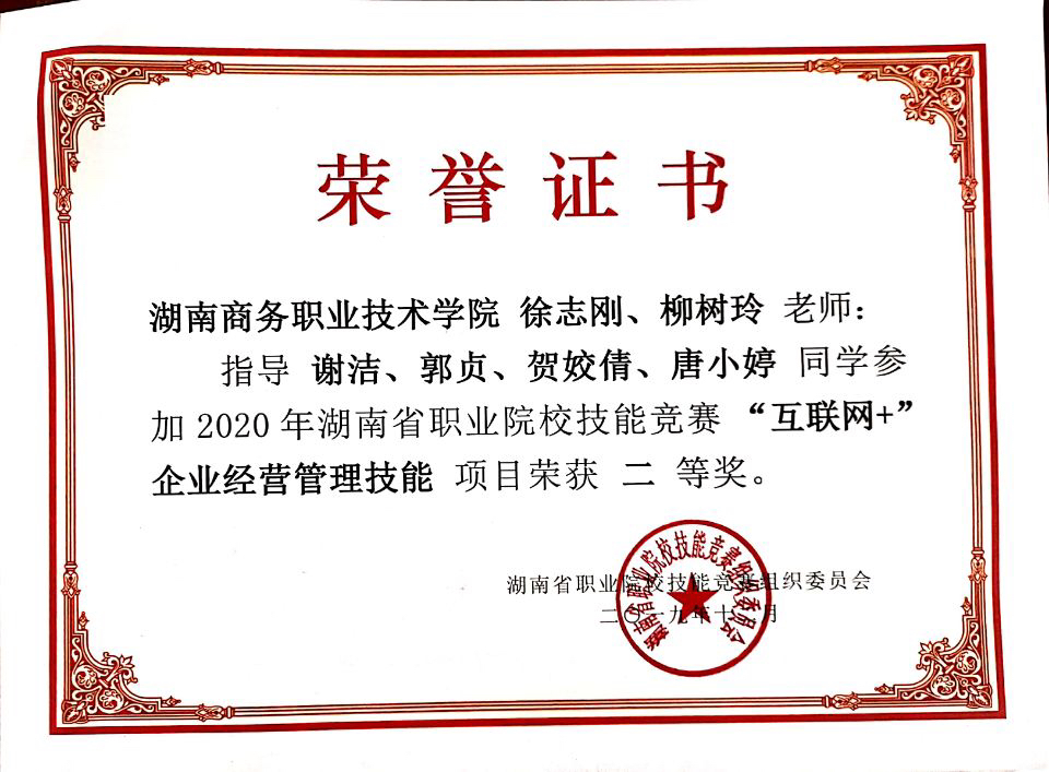 我院学生在2020年湖南省职业院校技能竞赛(互联网+企业经营管理技能)大赛中分别荣获二等奖、三等奖