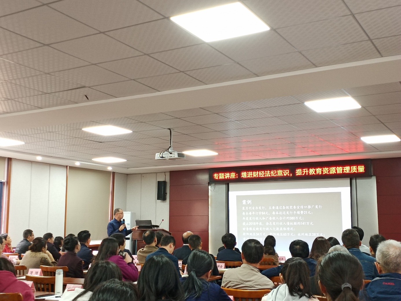 第一场讲座是由陈刚老师主讲的《增进财经法治意识,提升教育资源管理质量》。以“前期调研”来引导,从学校热水供应、图书馆、合同管理、食堂管理 、人力资源管理以及提供调研资料、部分中层干部作风、法律学习和内部学习控制制度学习这几方面展开了具体论述。还从资源管理使用的角度展开讨论,探讨了学校资源的占有,分配和使用。并指出落实管理规范关键是在于岗位轮岗,不相容职务的隔离以及手续间衔接紧密无缝。最后以多个案例的方式来诠释了这些论述。自觉地遵守国家财经法规,是学校这一法人主体的义务,也是每一个教育工作者个人的义务。我们必须严格执行财经法规,做到有法必依、守法必严、依法治校,依照财经法规来治理学校、管理学校财经工作。