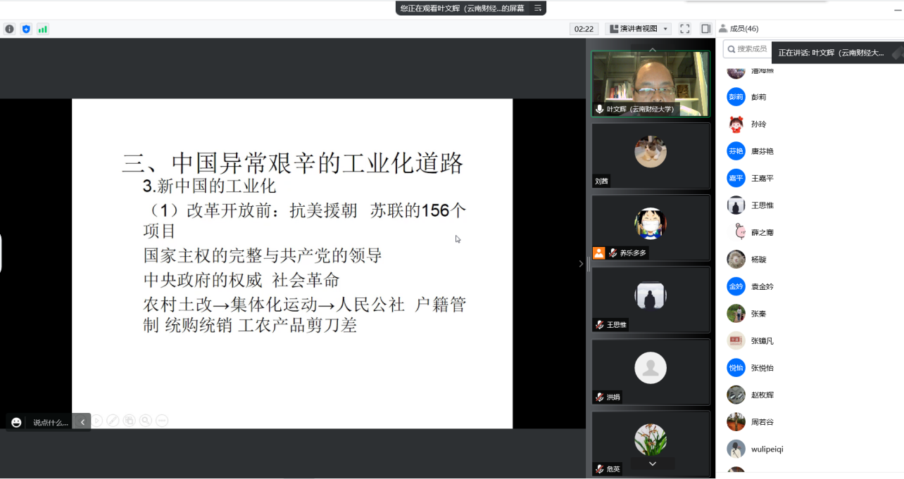 叶教授首先对“国民经济学”进行了一系列的讲解,其内容包括“国民经济学学科介绍、国民经济学的特点、和研究内容”,接着列举分析了其他几个主要国家的工业化历史和进程。然后从中国工业体系发展的历史角度,讲述了中国工业体系的发展,从异常艰辛的工业化道路到如今崛起后的双循环经济格局。