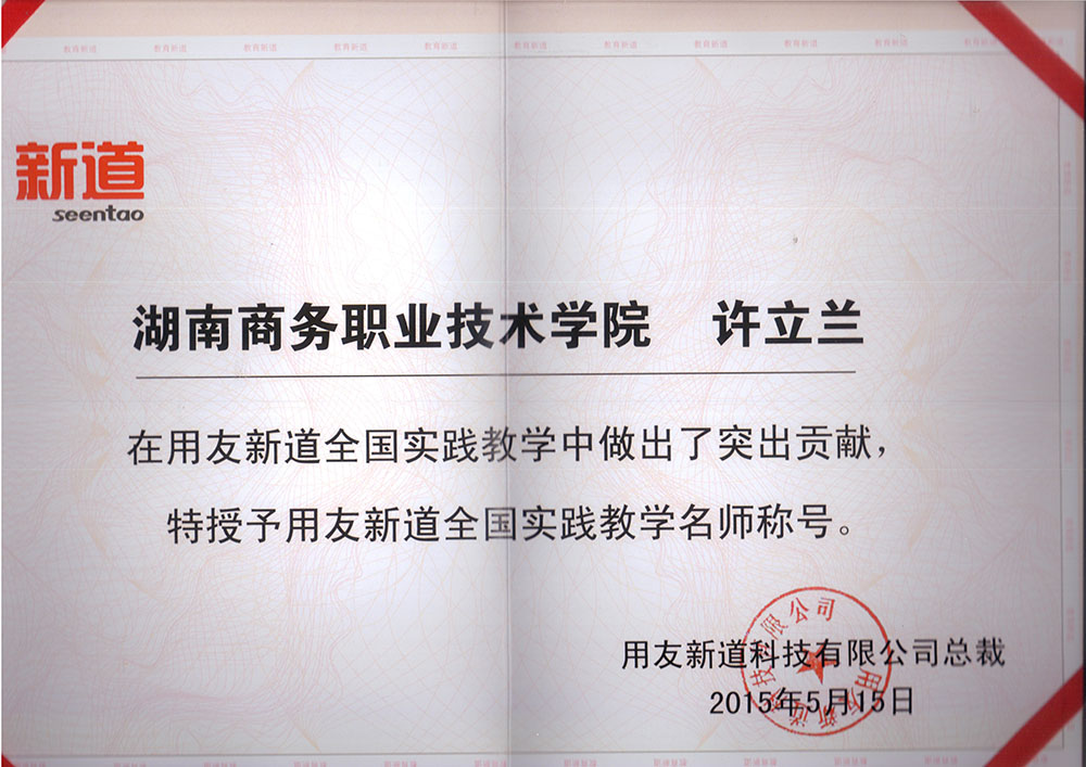 许立兰老师荣获2015年用友新道全国实践教学名师
