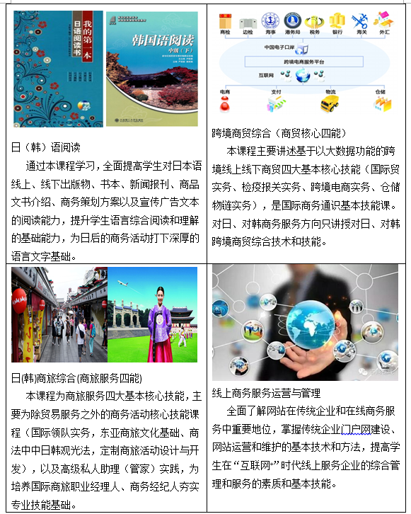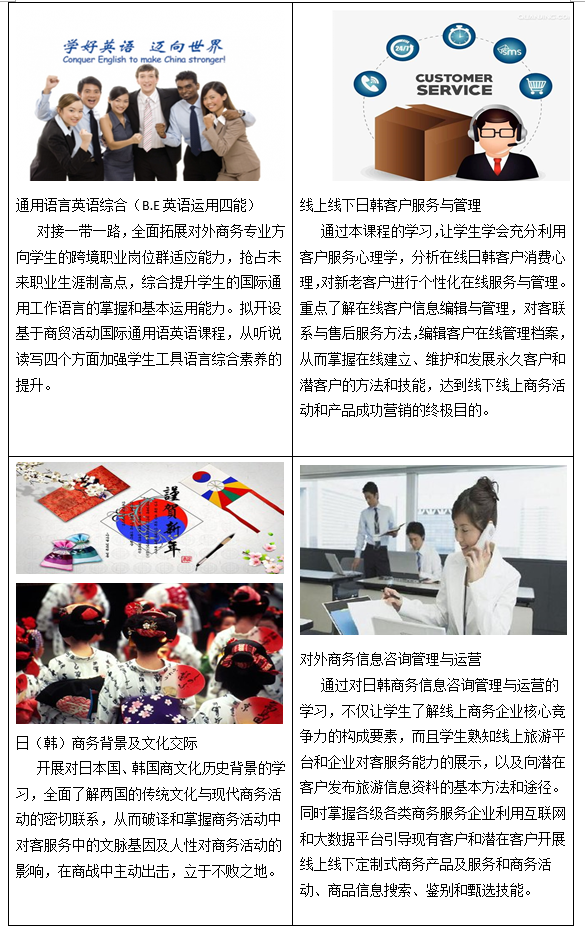 我院对外商务专业(英语、日语、韩语)可面向一切涉英语、日语、韩语的外企、外贸、文化旅游、商务综合服务机构、企事业单位及私人定制高级助理等行业,从事中外(英、日、韩)商务翻译、外经外贸、商务管理、旅游经纪、跨境导游、跨境电商、涉外商务信息咨询、私人高级管家服务等工作岗位,培养爱党爱祖国、爱岗敬业,恪守国际商务服务法度和现代商务基本准则的综合型对外商务服务与管理职业人,具有胜任相应工作岗位必备的涉外商务、商贸知识+外语语言实战技能+国际商务实践素养,熟悉国际商务基本理论与业务,掌握对外商务、商旅业务实际操作技能,具备较强语言听、说、读、写、译等语言实践交际能力,熟悉现代跨境线上、线下实践交际活动的现代商务高素质、高技术和高技能型人才。
