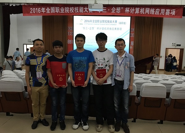 5月26日,2016年全国职业院校技能大赛高职组计算机网络应用赛项在江苏经贸职业技术学院成功举办,来自全国30个省、自治区、直辖市的58支代表队共174名选手参赛。我校代表队不畏强手、顽强拼搏,取得第7名好成绩,荣获二等奖第1名。本次比赛由苏命峰、谢林勇两位老师指导,代表队成员有13计网班陈浩、14计网班黄沐鑫和15计网班黄宏伟。比赛体现“互联网+”行动的内涵,重点考查参赛选手在云计算平台配置与应用、数据中心网络建设与优化、综合布线等方面的能力,对选手的专业技术与技能、综合素质与能力等都有很高的要求。