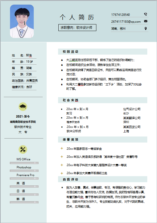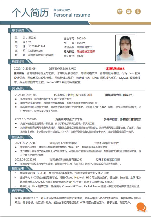 (本网讯  李博) 为了帮助广大学生更好地适应社会,增强就业意识,也为了提高我院学生的个人简历的整体质量,方便同学们更好的制定自己的人生目标和未来发展,提高同学们的总结能力、书面介绍能力、设计审美能力,帮助同学们增加勇气,为未来的求职面试打下基础。2022年6月17日,信息学院宿管部在线上举行了简历设计大赛。