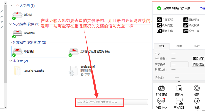 注意,当学生上传自己的毕业设计文档后,私有云盘管理系统需要通过一段时间对新上传的文档内容进行索引,索引完成后方能利用全文检索功能检索查重。索引时间根据文档内容确定,一般不超过24小时可以完成,也就是今天上传的文档,最迟明天可以检索得到。