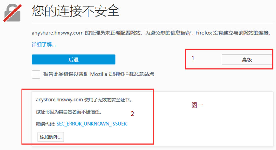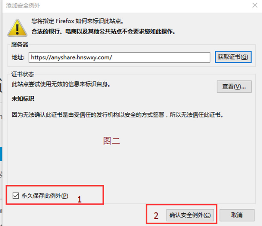 提示“您的连接不安全”,此时,您需要单击“图一”中的1号红色框中的“高级”,然后Firefox浏览器会自动呈现出2号红色框所示内容。单击2号红色框中的“添加例外”后,出现“图二”。确保“图二”中的1号红色框中的“永久保存此例外”已被勾选,然后单击“图二”中的2号红色框中的“确认安全例外”即可。