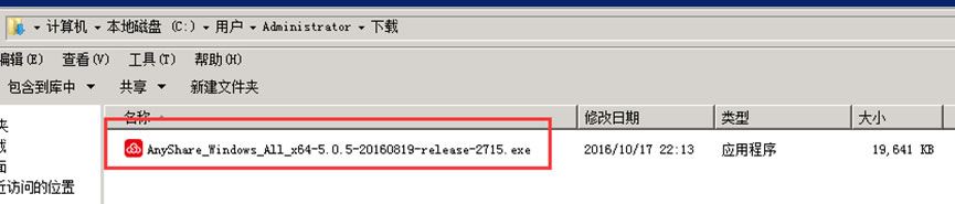 3.找到上一步已下载好的客户端软件,双击安装。如果下载没有问题,你可以自己的下载保存位置找到如下文件(仅针对64位操作系统):AnyShare_Windows_All_x64-5.0.5-20160819-release-2715.exe