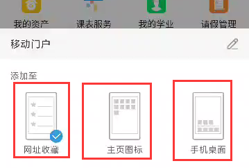 可以根据个人喜好,将移动端信息门户添加至“网址收藏”“主页图标”或“手机桌面”。建议至少添加至“手机桌面”,今后打开移动端信息门户时就像打开APP一样方便。