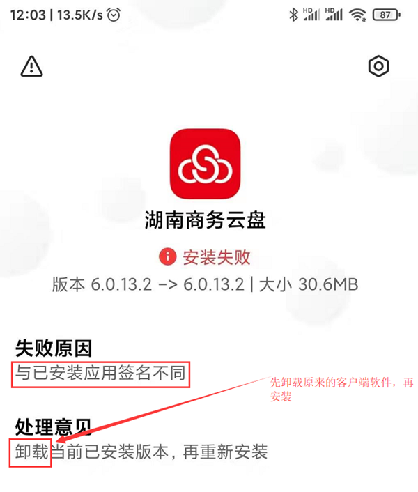 由于原来的客户端软件是非定制化的软件,软件定制化后的数字签名证书与原来不一致,所以在原有基础上覆盖安装时,会提示安装失败,此时需要先卸载再重新安装定制化软件。如下图所示: