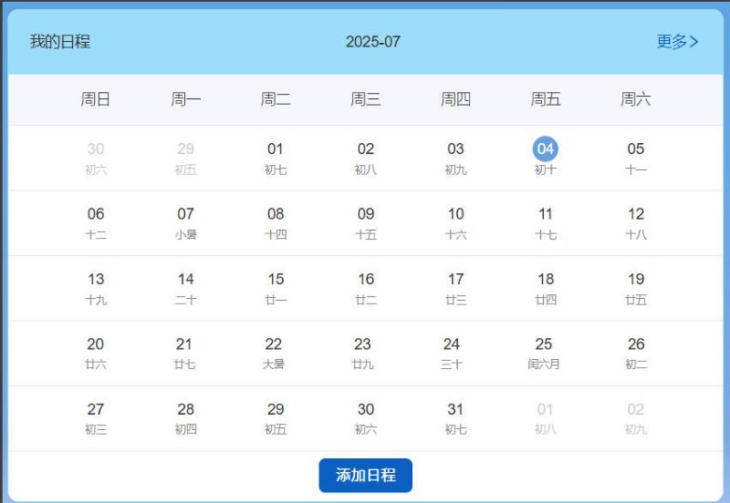在“我的日程”模块中,用户可以查看日程信息,点击“更多”,可以查看日程的详细信息;点击“添加日程”,填写相关信息之后可以新增日程。