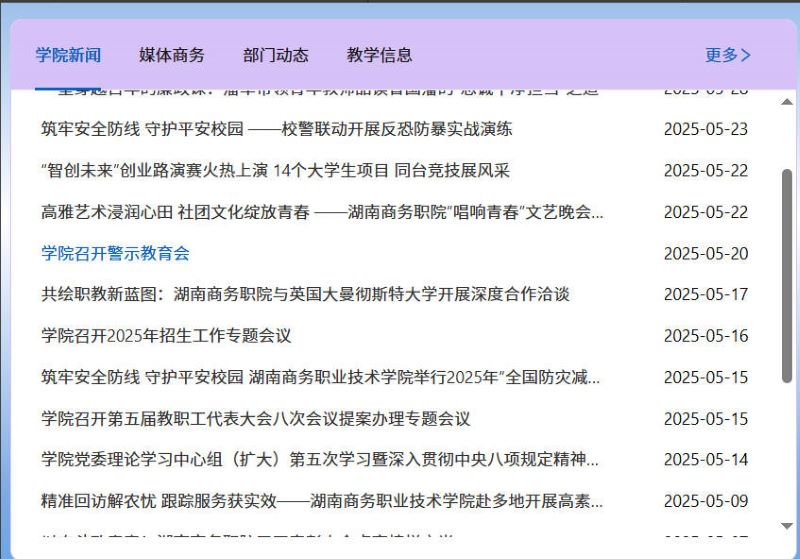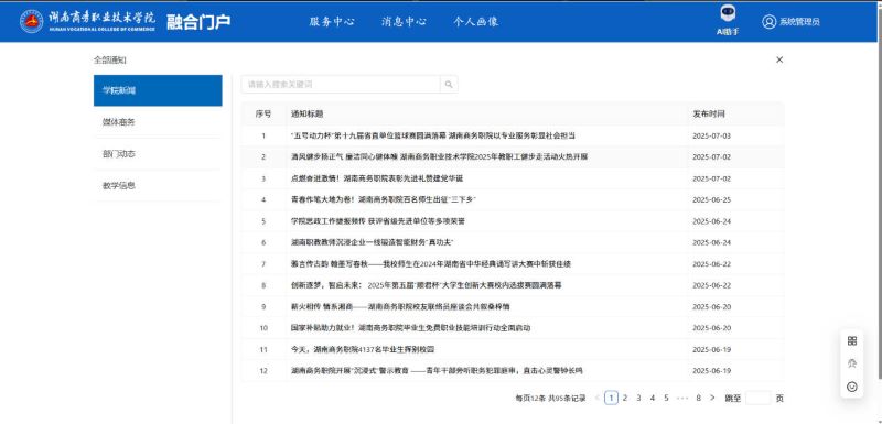 该部分主要是学校相关公告与新闻信息的展示,在主页面可以看到学校最新的公告通知,点击“更多”可以看到时间更久的更多公告(显示公告状态等)。
