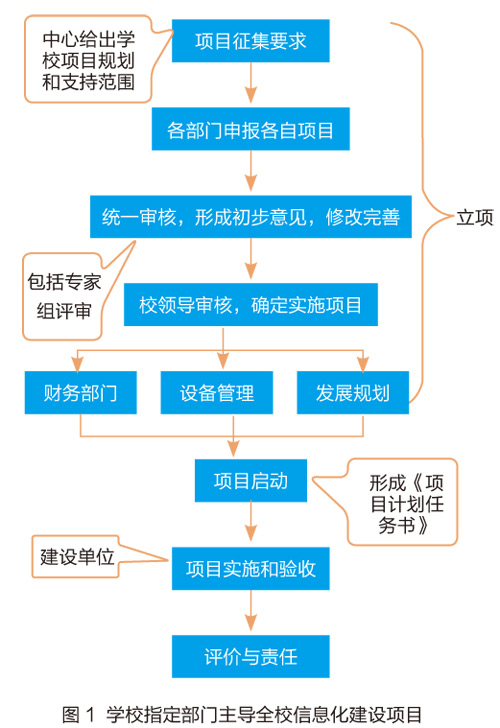 学校指定部门主导全校信息化建设项目,由信息技术中心(以下以信息技术中心为主导说明,简称“中心”)实现所有信息化建设项目立项、审批、验收和评价的全过程管理,项目执行除外(如图1所示)。