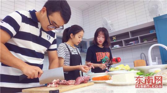 洗菜、切菜、烹饪……傍晚饭点,福州大学紫金矿业学院2017级学生张玉松正在福州大学共享厨房里与同学紧张地忙碌着。上个月,福建首家高校开放式厨房共享餐厅在福州大学开张,受到不少学生的关注。
