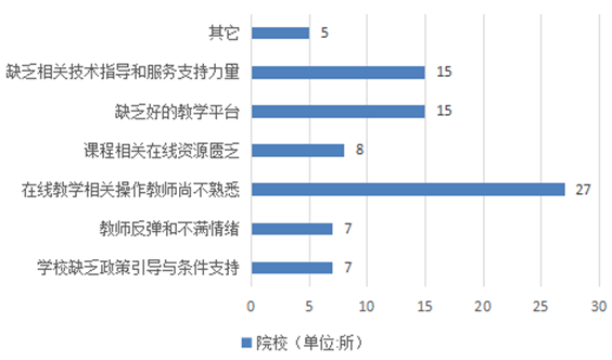 对于疫情期间学校开展在线教学存在的诸多困难,大多数高校认为主要表现在教师对在线教学相关操作尚不熟悉;另外学校缺乏好的教学平台与相关技术指导、服务支持力量也是重要因素;同时课程相关在线资源匮乏也是在线教学开展困难的部分原因,具体情况如图13所示。