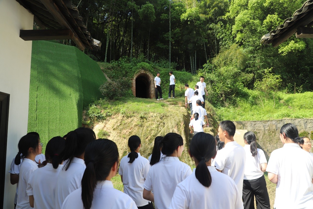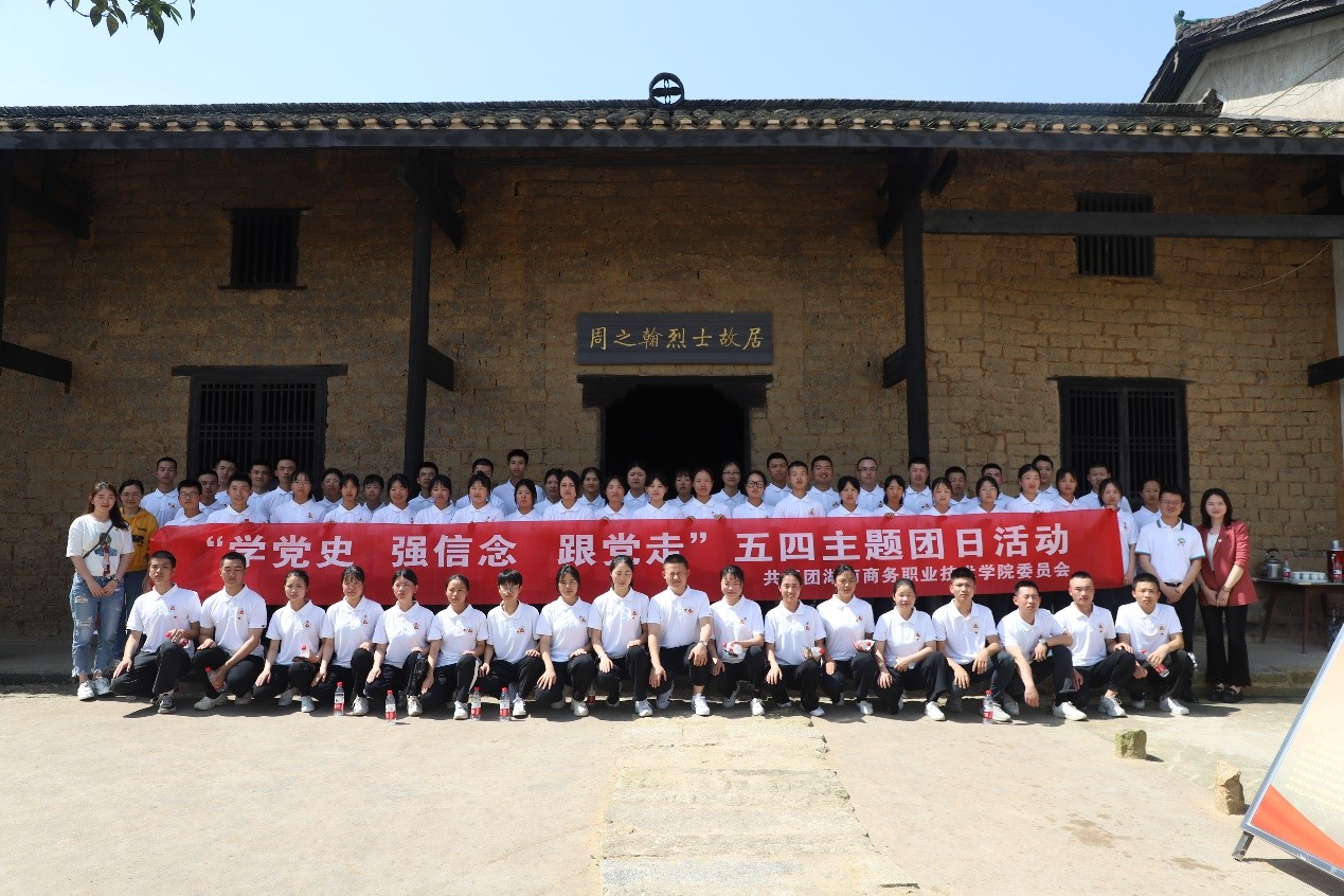 随后师生们到达了湖南和平解放秘密电台工作站旧址,它是一座四合院建筑,位于长沙市望城区桥驿镇洪家村付家组,是湖南和平起义时中共与国民党湖南当局联络所设置的秘密电台。后山有个防空洞是为躲避日军入侵而修建,湖南和平解放秘密电台在紧急情况下就藏匿于此,洞口直立约一人高,洞长3米,周围树木繁茂,位置十分隐蔽,不易发现。湖南和平解放秘密电台旧址对研究湖南和平解放具有重要的历史价值,商务职院的师生们在这里重温了庄严的入团宣誓,铿锵有力的誓言响彻全场。