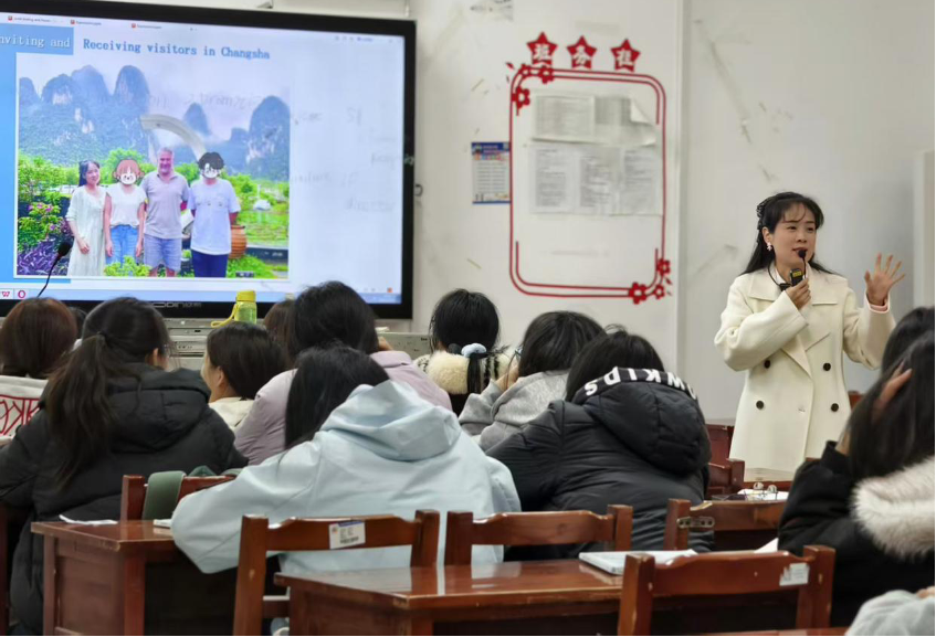 课程的一大亮点,在于将语言教学与文化浸润、思政育人深度融合。聂点点老师结合自身亲身经历,巧妙融入文化自信理念,引导学生学会用英语讲好中国故事、湖南故事、长沙故事。在小组展示环节,学生们围绕“用英语接待访客并介绍长沙文化”展开主题汇报,将橘子洲、岳麓书院等本土文化符号融入英文表达,不仅实现了知识输入与输出的有机统一,更在实践中锤炼了跨文化交际能力。此外,聂老师还创新引入闯关游戏教学模式,将核心词汇记忆转化为趣味关卡,让学生在轻松比拼中巩固所学,真正做到学思用贯通、知信行统一。