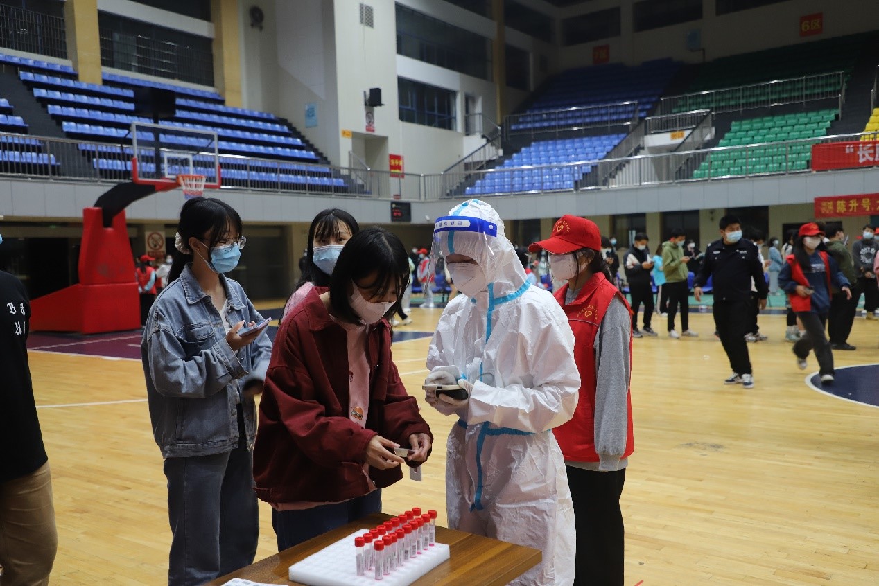 师生均佩戴口罩,在体育馆外有秩序的排队等候做核酸检测。体育馆内还播放着新冠肺炎的自我防护知识。